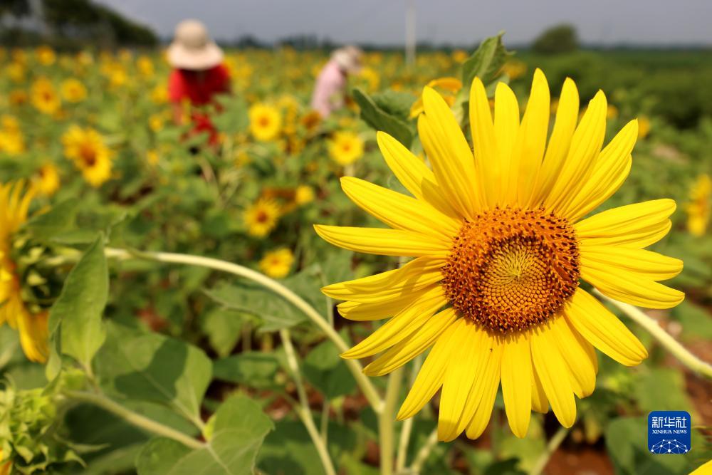 7月23日,山東省棗莊市市中區農民在田間管護向日葵。