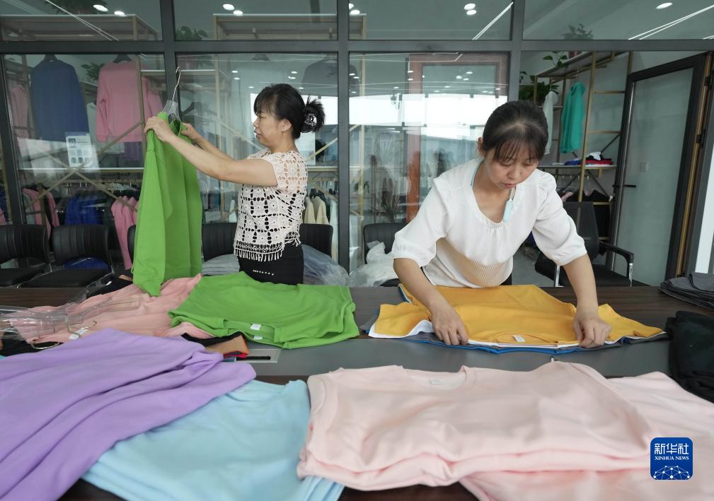 7月23日,工人在肅寧縣一家針紡服裝企業(yè)的展室整理準備更換的展品。