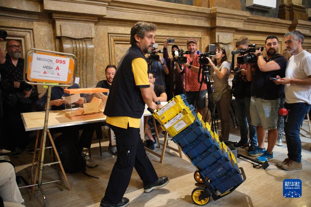 7月23日,一名郵遞員在馬德里一處投票點(diǎn)運送郵寄選票。
