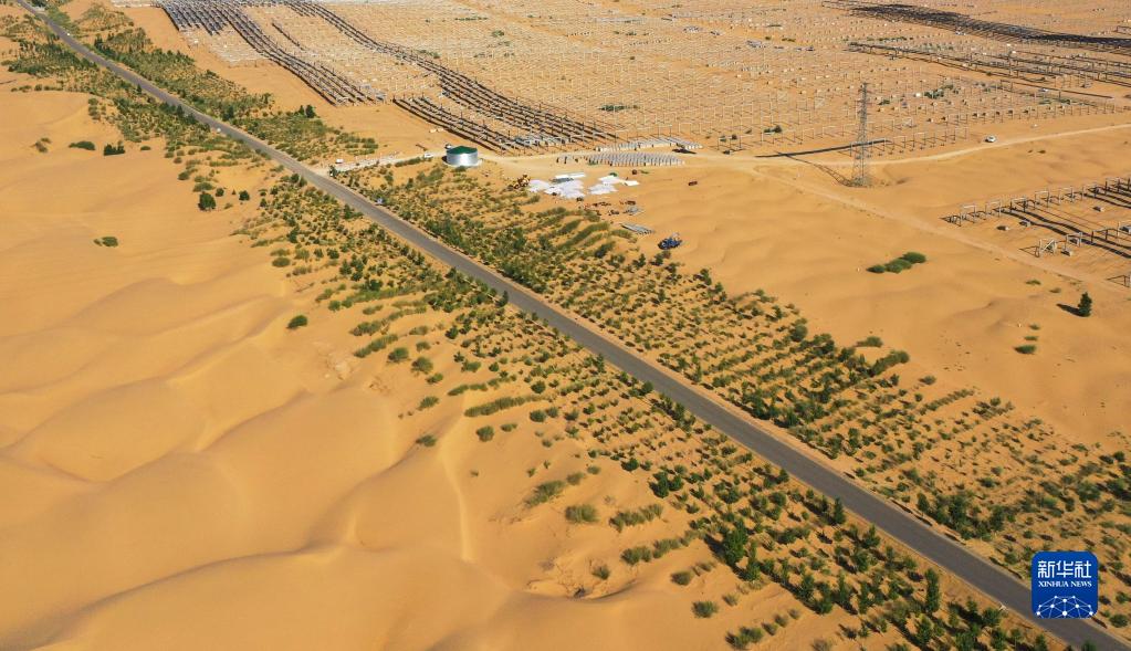 夏日時(shí)節,內蒙古自治區杭錦旗境內的穿沙公路綠意盎然,綠色沿著(zhù)道路前行,并向兩旁的沙地鋪展,猶如一條條“綠色動(dòng)脈”在庫布其沙漠中綿延。