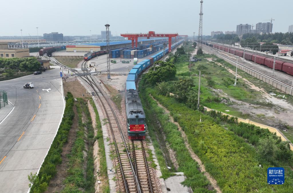 7月24日,“燕趙號”中越班列從河北省石家莊國際陸港駛出(無(wú)人機照片)。