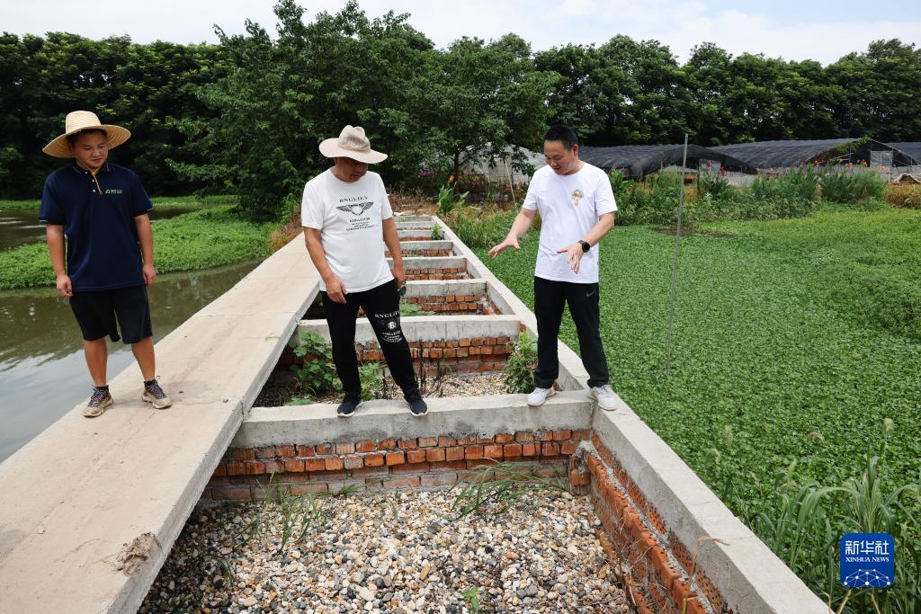 7月10日,謝永宏(右)在湖南省益陽(yáng)市大通湖區河壩鎮沙堡洲村一處牛蛙養殖基地,介紹由他們設計的“三池兩壩”養殖尾水處理設施。大通湖地處洞庭湖腹地,被稱(chēng)作“洞庭之心”。新華社記者 金立旺 攝