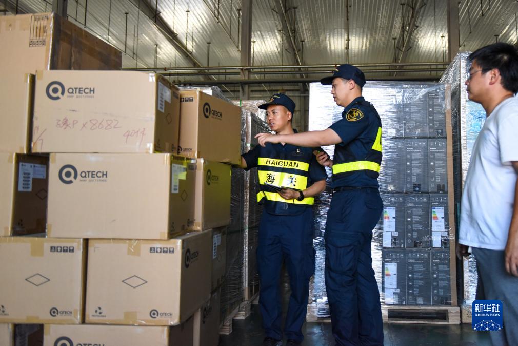 在新疆阿拉山口綜合保稅區內的跨境電子商務(wù)分揀清關(guān)中心,海關(guān)工作人員在查驗貨物(7月24日攝)。
