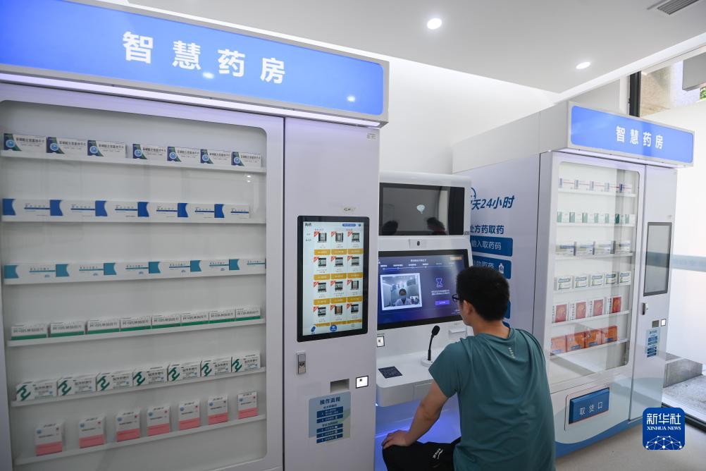 7月25日,居民在諸暨市浣東街道東盛社區衛生服務(wù)站的智慧藥房?jì)冗M(jìn)行遠程問(wèn)診,問(wèn)診完畢后可以開(kāi)具處方并配好日常用藥。