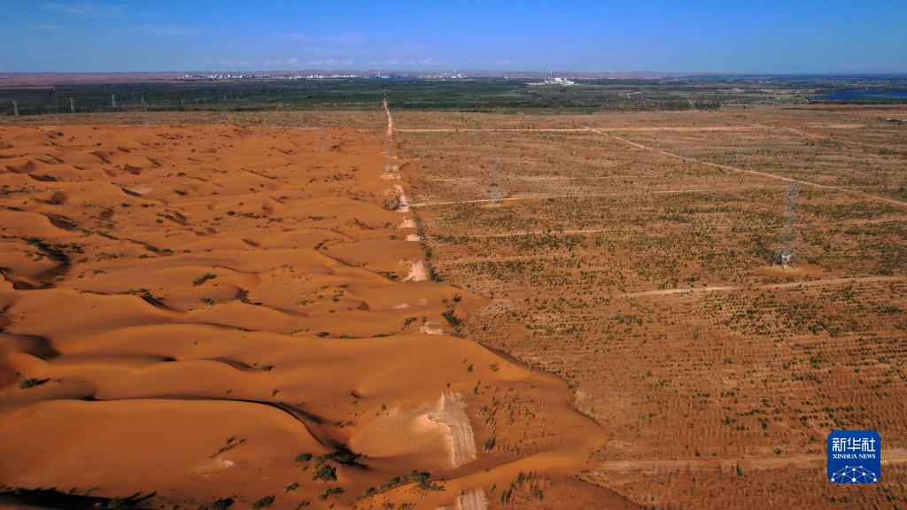 位于中衛市沙坡頭區騰格里沙漠邊緣的防護林帶與沙漠交匯處(7月21日攝,無(wú)人機照片)。