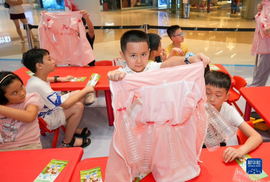 7月25日,在重慶市九龍坡區楊家坪街道一商場(chǎng)的預防溺水安全教育社區服務(wù)點(diǎn),一名小男孩展示利用學(xué)習到的預防溺水知識制作的簡(jiǎn)易救生衣。
