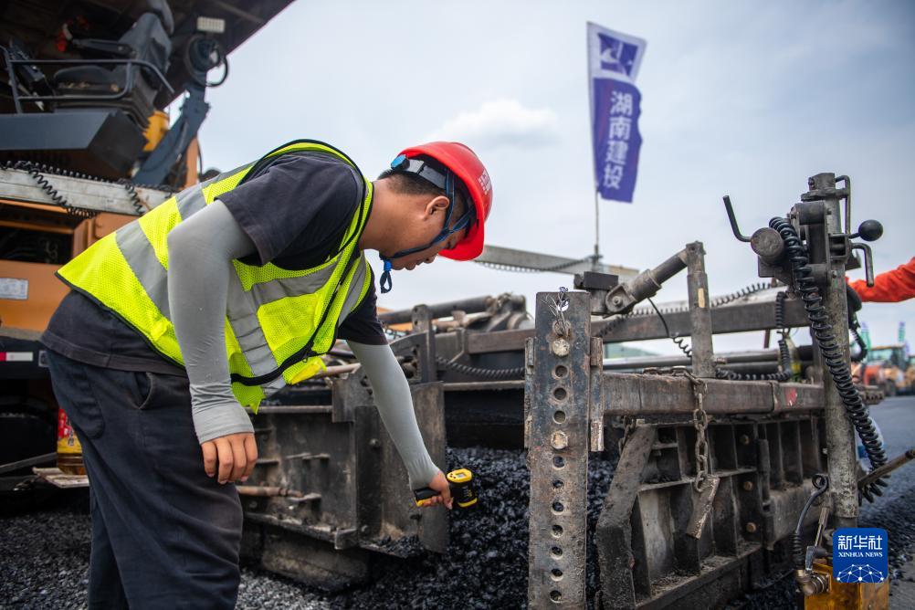 7月25日,在衡永高速路面工程施工現場(chǎng),工人在測量瀝青溫度。