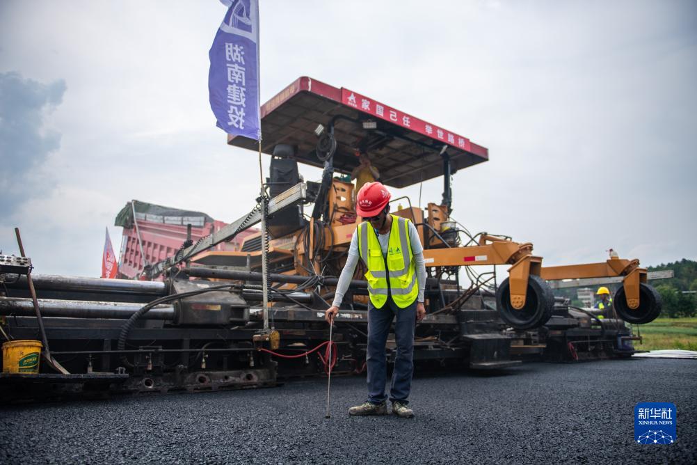 7月25日,在衡永高速路面工程施工現場(chǎng),工人在測量瀝青攤鋪厚度。