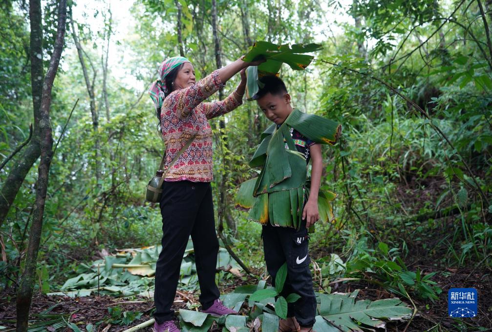 7月23日,張普忠的老伴王素英(左)用芭蕉葉給孫子制作“衣服”。新華社記者 陳欣波 攝