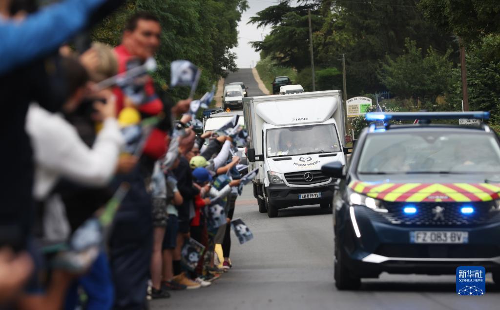 7月25日,在法國圣艾尼昂市博瓦勒野生動(dòng)物園外,人們送別搭載熊貓“圓夢(mèng)”的車(chē)離開(kāi)。