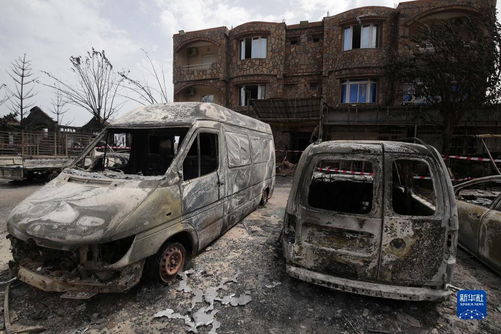 這是7月25日在阿爾及利亞貝賈亞省拍攝的被野火燒毀的房屋和車(chē)輛。