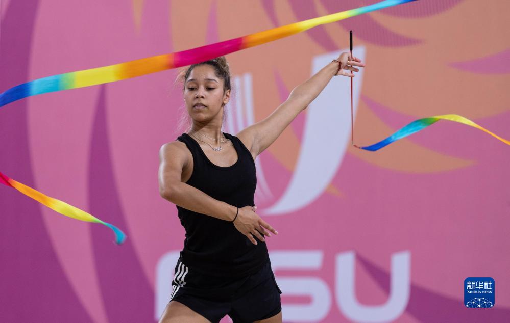 7月25日,南非大學(xué)生藝術(shù)體操隊的選手在成都體育學(xué)院體操館訓練。