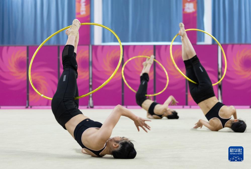 7月25日,中國大學(xué)生藝術(shù)體操隊的選手們在成都體育學(xué)院體操館訓練。
