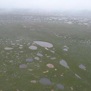 風(fēng)雪彌漫中的當曲濕地(7月24日攝,無(wú)人機照片)。