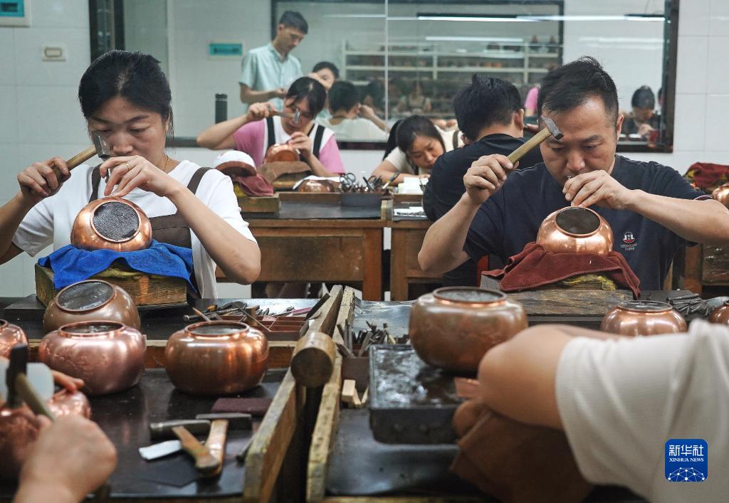 在位于江西省貴溪市的江西中鼎金屬工藝有限公司的車(chē)間里,匠人們在雕刻銅壺(7月13日攝)。