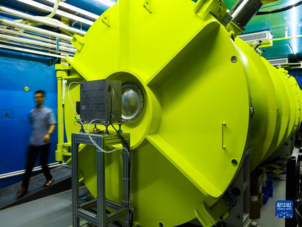 科研人員從中國散裂中子源的微小角中子散射譜儀散射腔系統旁經(jīng)過(guò)(7月18日攝)。
