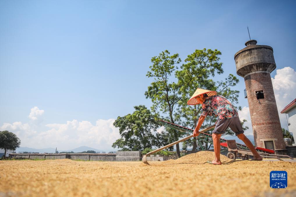 夏收時(shí)節,湖南省永州市藍山縣早稻喜獲豐收,農民趁著(zhù)晴好天氣忙著(zhù)收割、晾曬,一派豐收景象。