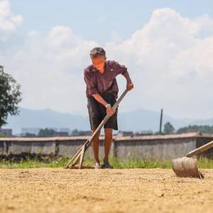 7月26日,湖南省永州市藍山縣塔峰鎮成家村村民在晾曬稻谷。