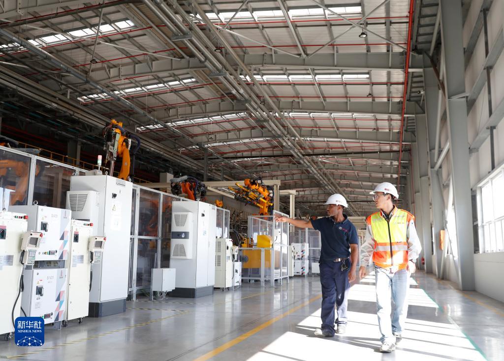 5月10日,在南非東開(kāi)普省北汽南非工廠(chǎng),邦加尼(左)與中國同事方龍在工作中交流。