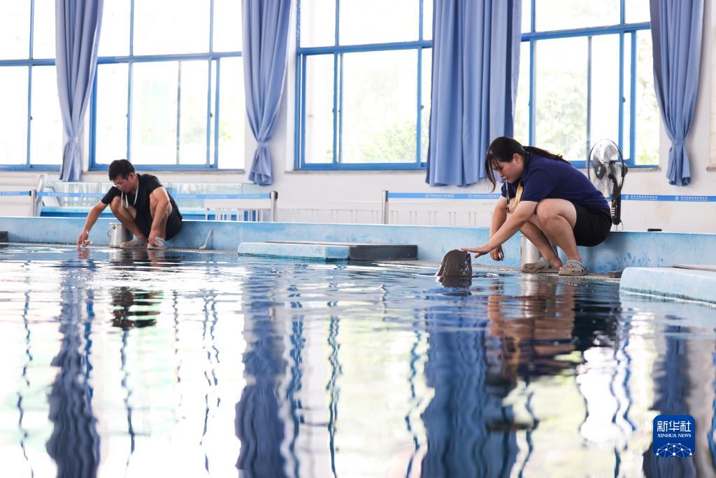 7月12日,中國科學(xué)院水生生物研究所白鱀豚館訓練員在給長(cháng)江江豚喂食。