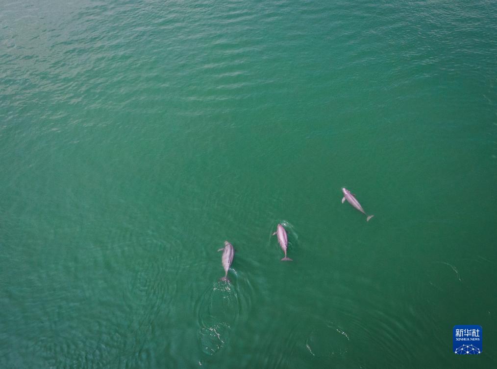 在湖北省宜昌市,長(cháng)江江豚在水中嬉戲(2021年5月11日攝,無(wú)人機照片)。