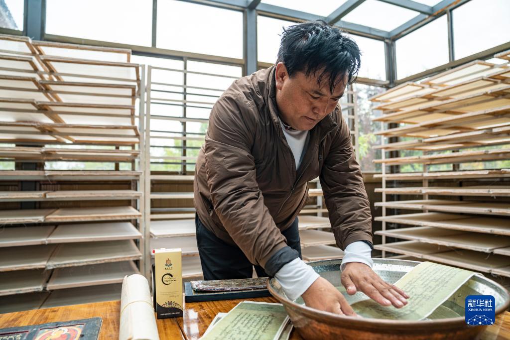 在西藏米林市羌納鄉西嘎門(mén)巴村,南迦巴瓦童螺嘎布工藝品農民專(zhuān)業(yè)合作社的工作人員正在測試藏紙的防水性(7月26日攝)。