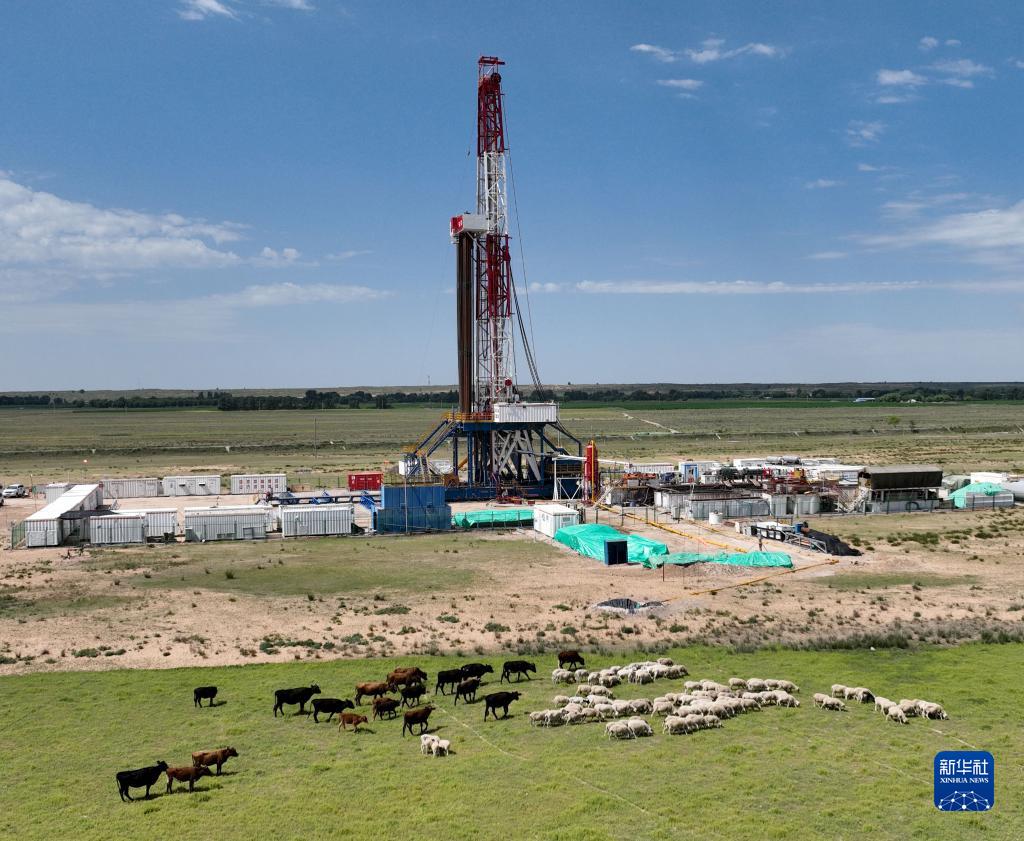 在長(cháng)慶油田蘇里格氣田一處鉆井平臺旁,牛羊悠閑地吃著(zhù)草(7月24日攝,無(wú)人機照片)。