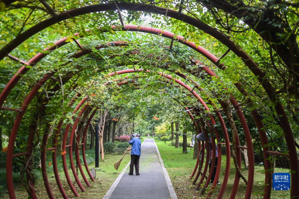 7月27日,嘉興市南湖區新豐鎮竹林村的公園內,村民在清掃道路。