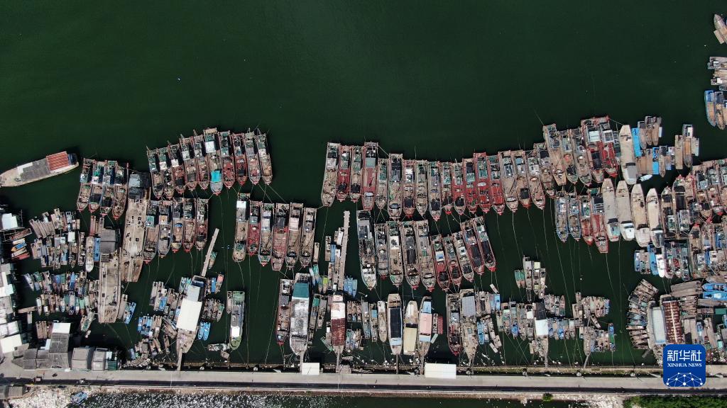 7月27日在廣東省潮州市饒平縣三百門(mén)漁港拍攝的回港避風(fēng)的漁船(無(wú)人機照片)。