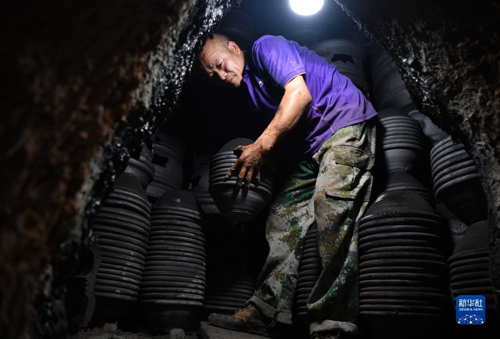 7月27日,制陶藝人在盆窯村的窯爐內搬運燒制好的黑陶產(chǎn)品。