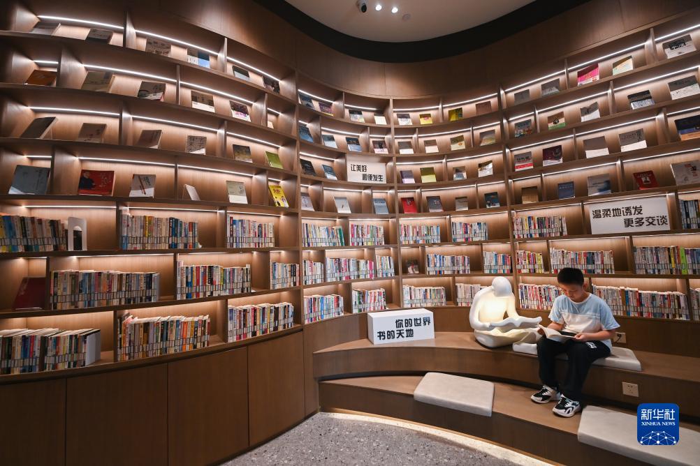7月27日,兒童在嘉興市南湖區余新鎮漁里未來(lái)社區“向日葵親子小屋”的天空書(shū)城里看書(shū)。