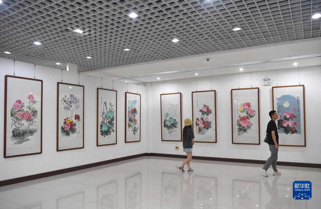 7月26日,來(lái)訪(fǎng)者在平樂(lè )社區的牡丹畫(huà)創(chuàng )意產(chǎn)業(yè)園區展廳內觀(guān)賞牡丹畫(huà)。