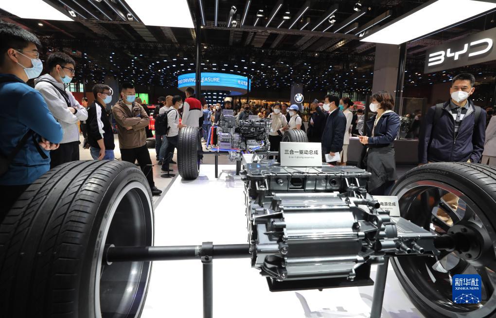 2023年4月24日,參觀(guān)者在第二十屆上海車(chē)展比亞迪汽車(chē)展臺展出的DM-P插混動(dòng)力單元模型展品前駐足觀(guān)看。