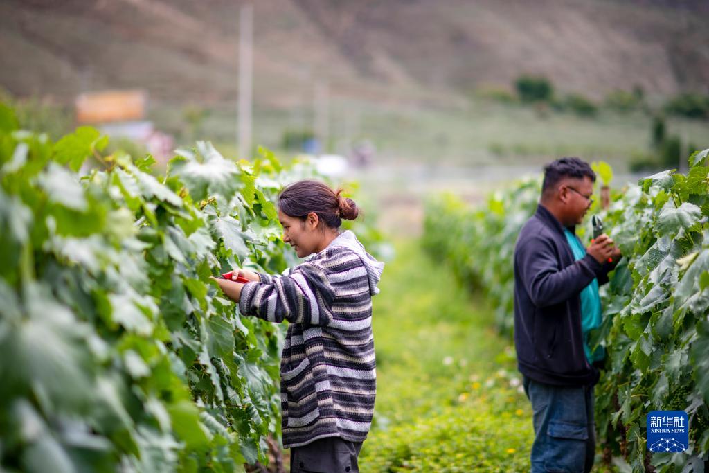 7月26日,桑日縣一家葡萄酒企業(yè)的員工曲珍(左)與同事在為葡萄剪枝。