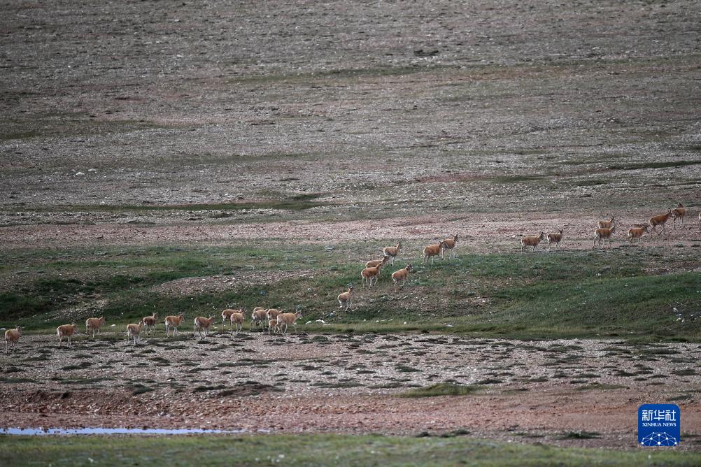 7月28日,一群藏羚羊通過(guò)青藏公路后前往棲息地。