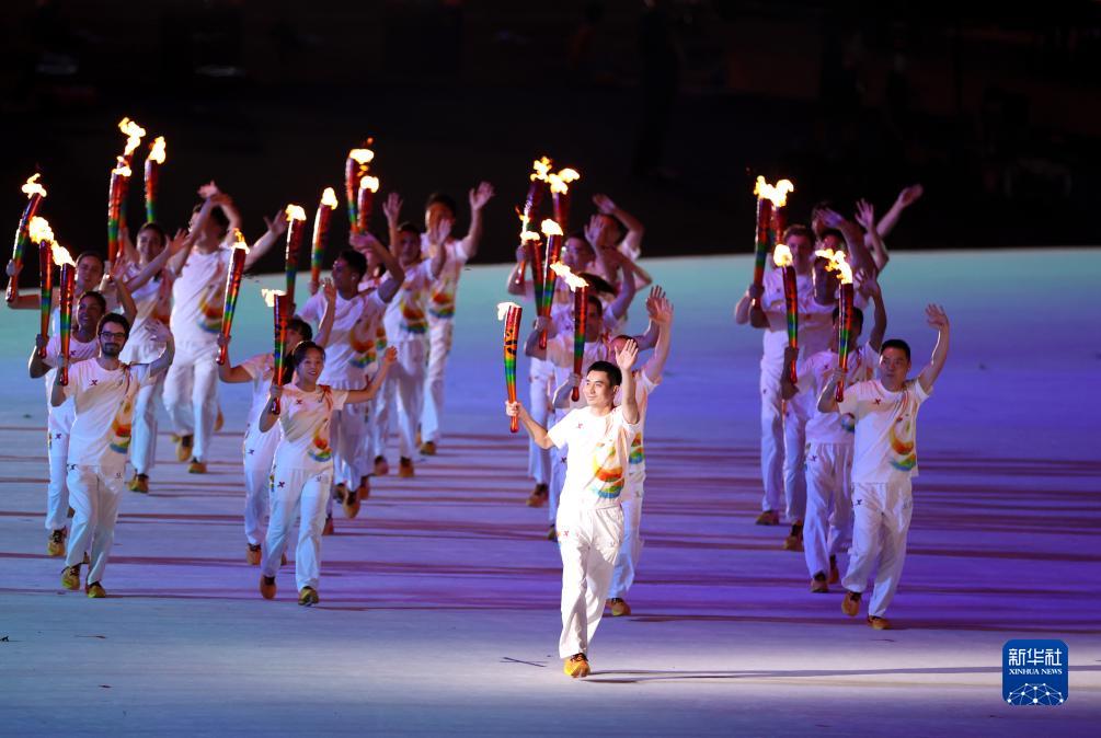 7月28日,火炬手葉光富(前)在開(kāi)幕式上。