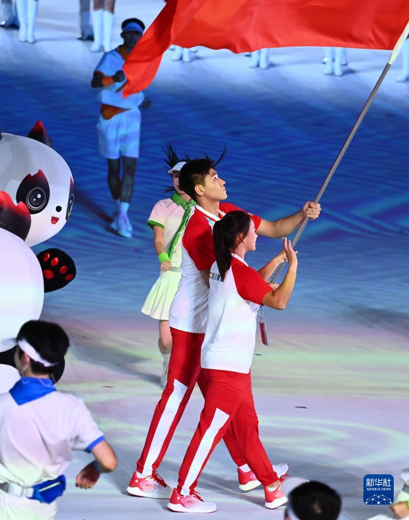 7月28日,中國大學(xué)生體育代表團旗手胡朕卓(左)與郭涵煜在開(kāi)幕式上入場(chǎng)。