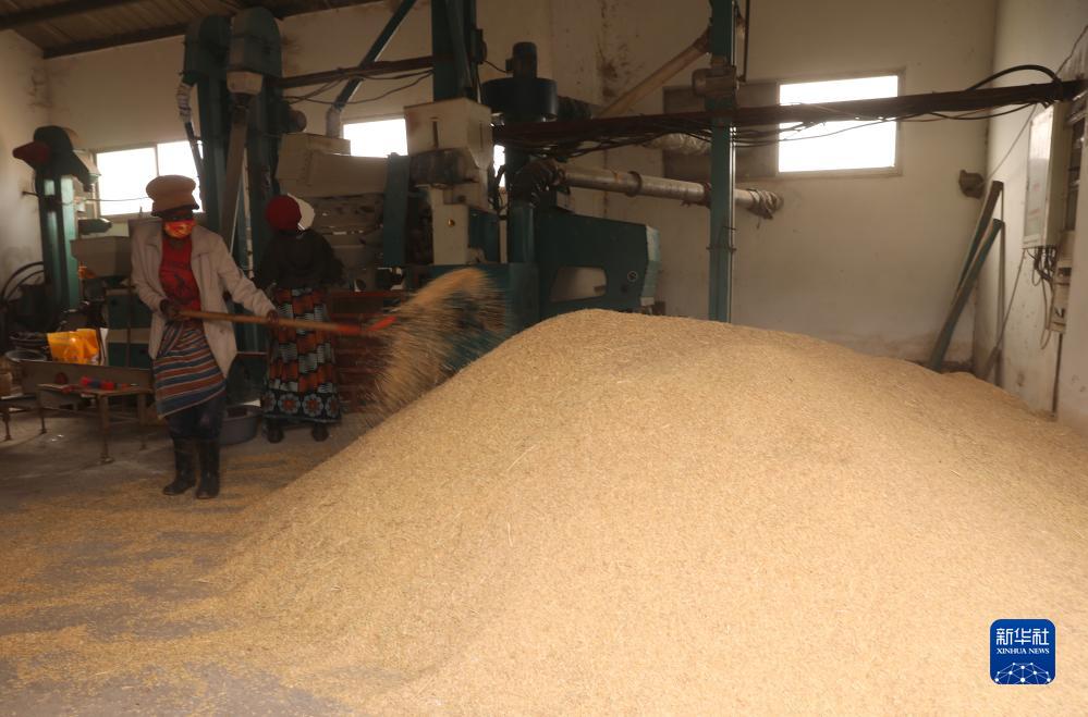 7月25日,在莫桑比克馬普托省博阿內地區,工人在中莫農業(yè)技術(shù)示范中心加工水稻。