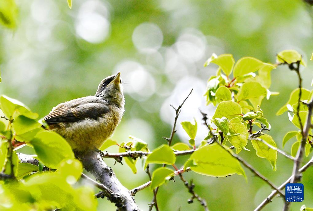 在拉薩市城關(guān)區一處庭院的樹(shù)枝上,一只伯勞幼鳥(niǎo)在四處觀(guān)望(7月28日攝)。