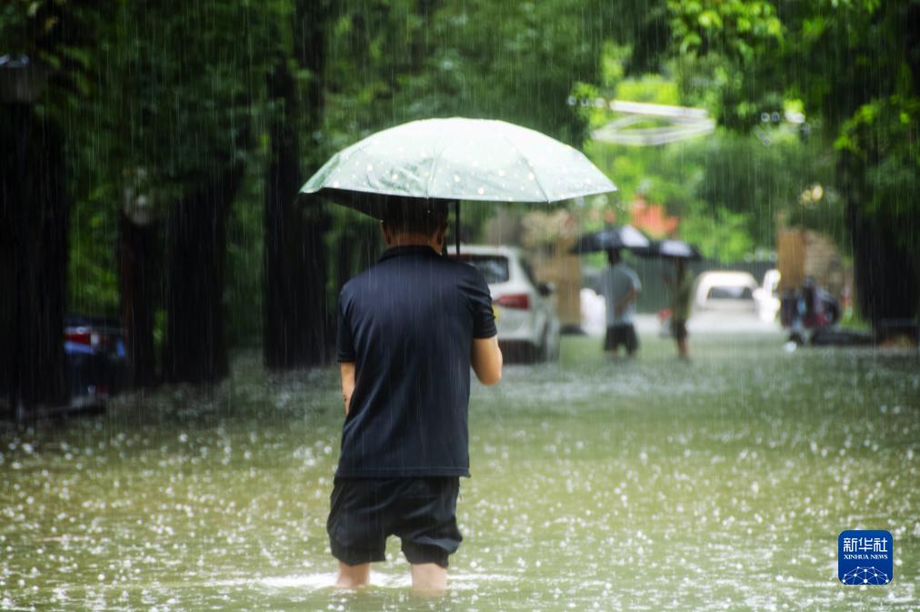 7月29日,位于福州市福新路上的某小區積水嚴重,一名市民涉水回家。