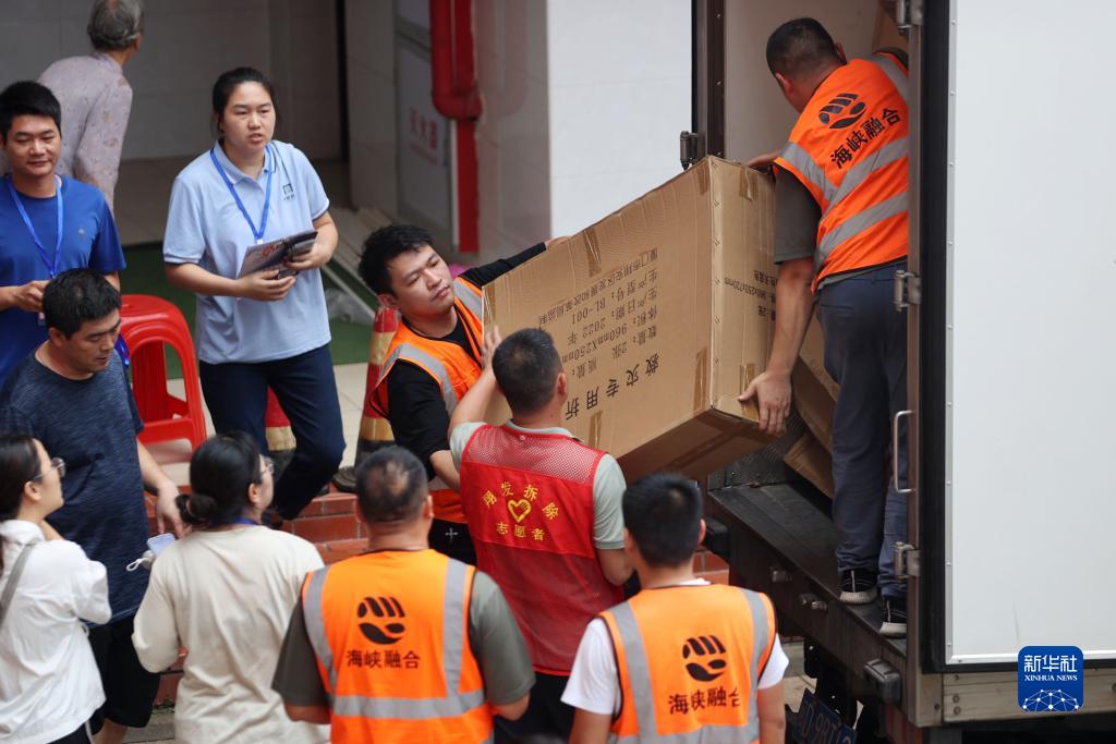 7月29日,在福建省廈門(mén)市新圩學(xué)校臨時(shí)安置點(diǎn),志愿者在搬運物資。