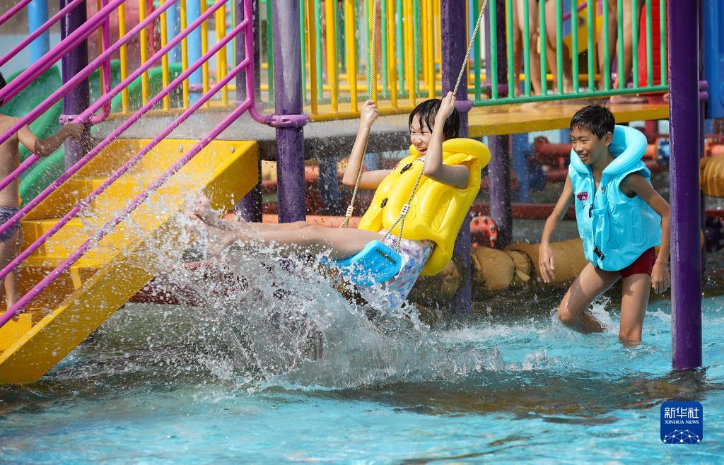 7月29日,孩子們在貴州省黔東南苗族侗族自治州丹寨縣揚武鎮鄉村水上樂(lè )園玩水。