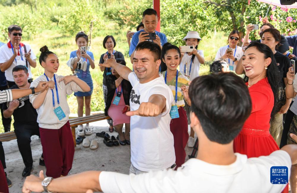 泰國藝術(shù)發(fā)展學(xué)院舞蹈團的演員和中國新疆藝術(shù)劇院木卡姆藝術(shù)團的演員在新疆藝術(shù)劇院共舞(7月24日攝)。