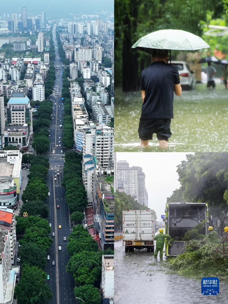 這是一張拼版照片:左圖為7月30日拍攝的福州市晉安區福新路,路上積水已退去,交通秩序恢復暢通(無(wú)人機照片);右上圖為7月29日,位于福州市晉安區福新路上的某小區積水嚴重,一名市民涉水回家;右下圖為7月29日,工作人員在福州市晉安區福新路上清理被臺風(fēng)刮倒的樹(shù)木。