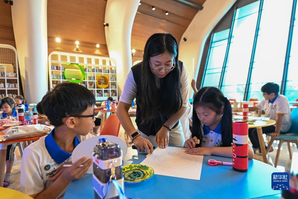 7月29日,在國家海洋博物館,學(xué)生們在工作人員指導下制作“時(shí)間之鐘”,從時(shí)間與空間尺度認識世界。