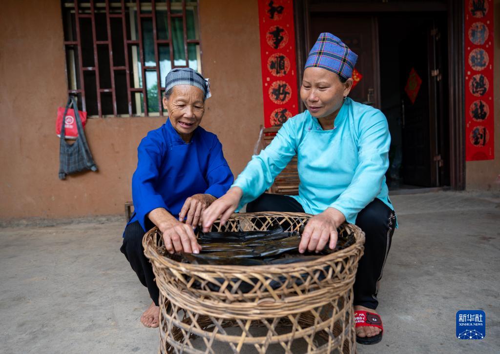 7月30日,兩名坡芽村壯族村民在自家院子里晾剛制作好的壯族美食褡褳粑。