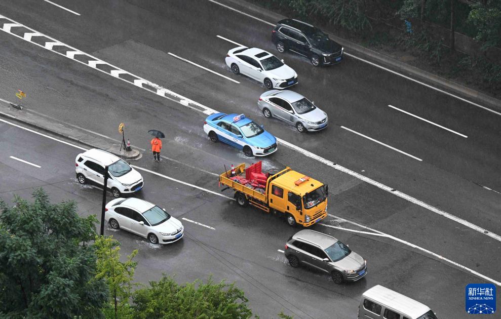 7月31日,工作人員在河北省石家莊市新華區北二環(huán)一個(gè)易積水點(diǎn)巡查。