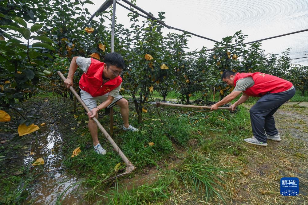 8月1日,黨員志愿者在湖州市東林鎮三合村的蜜梨種植基地幫助種植戶(hù)疏通溝渠。
