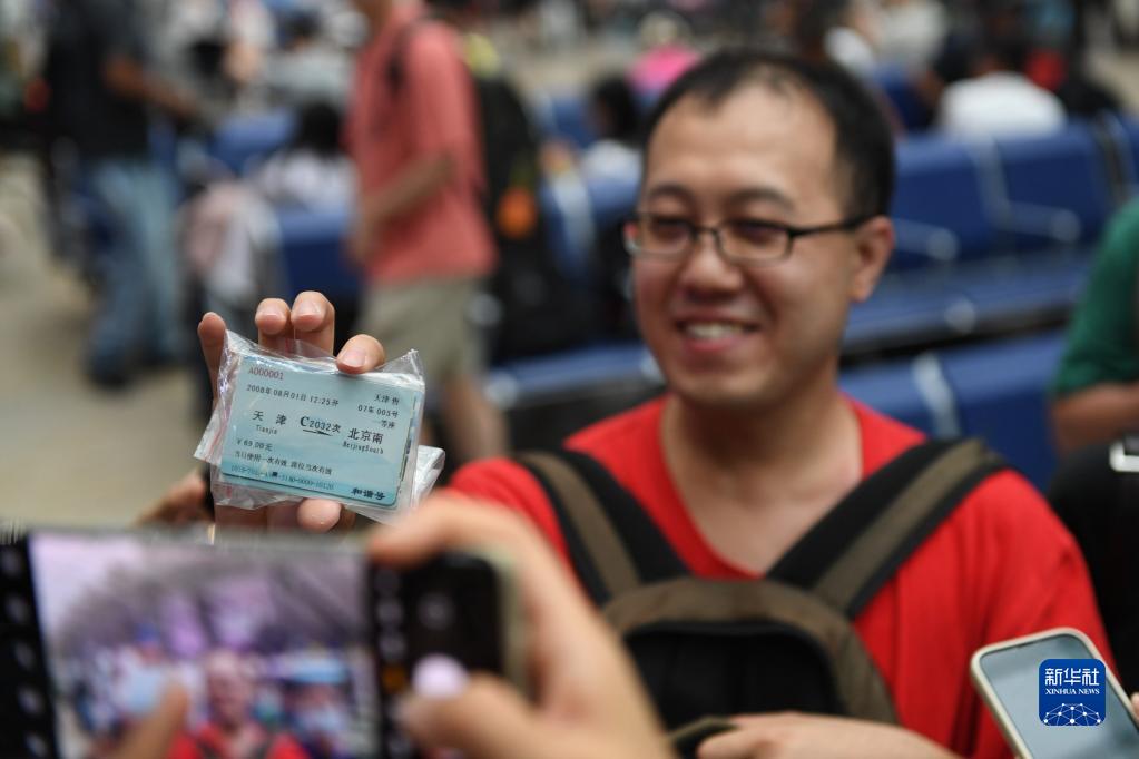 8月1日,一名旅客向記者展示2008年8月1日京津城際鐵路開(kāi)通運營(yíng)時(shí)所購買(mǎi)的火車(chē)票。