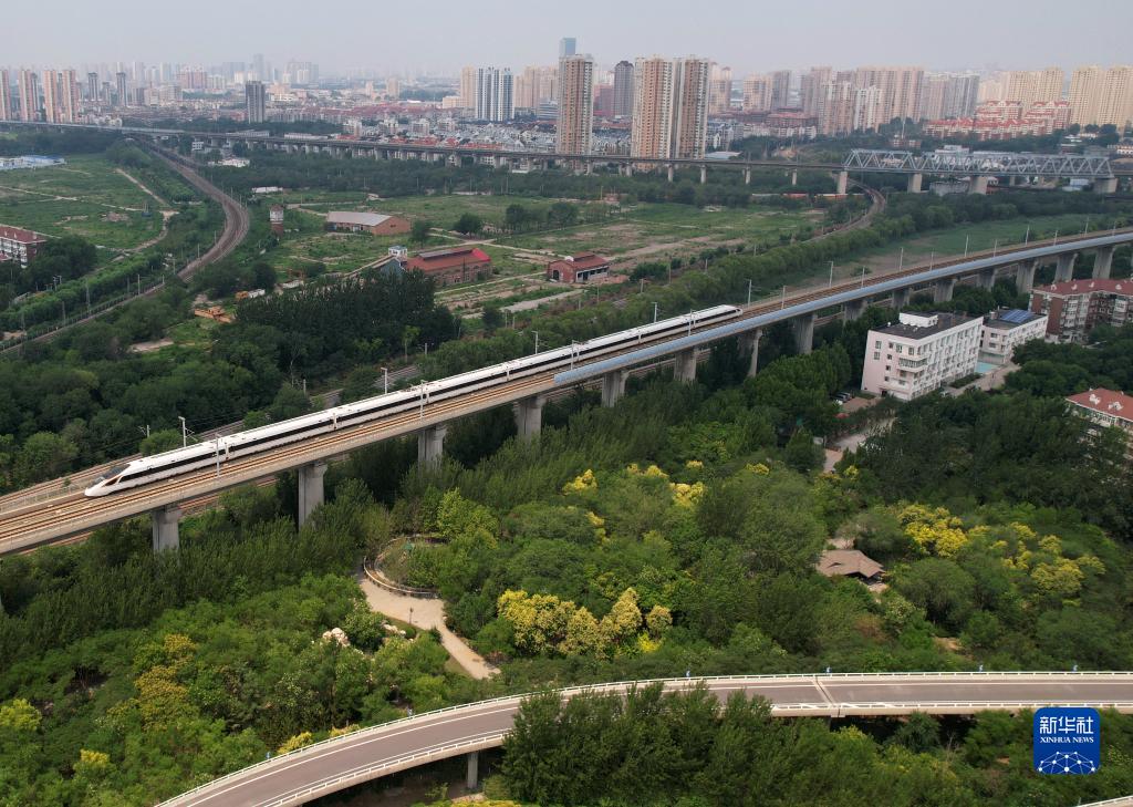 京津城際列車(chē)從天津城區穿行(7月20日攝,無(wú)人機照片)。